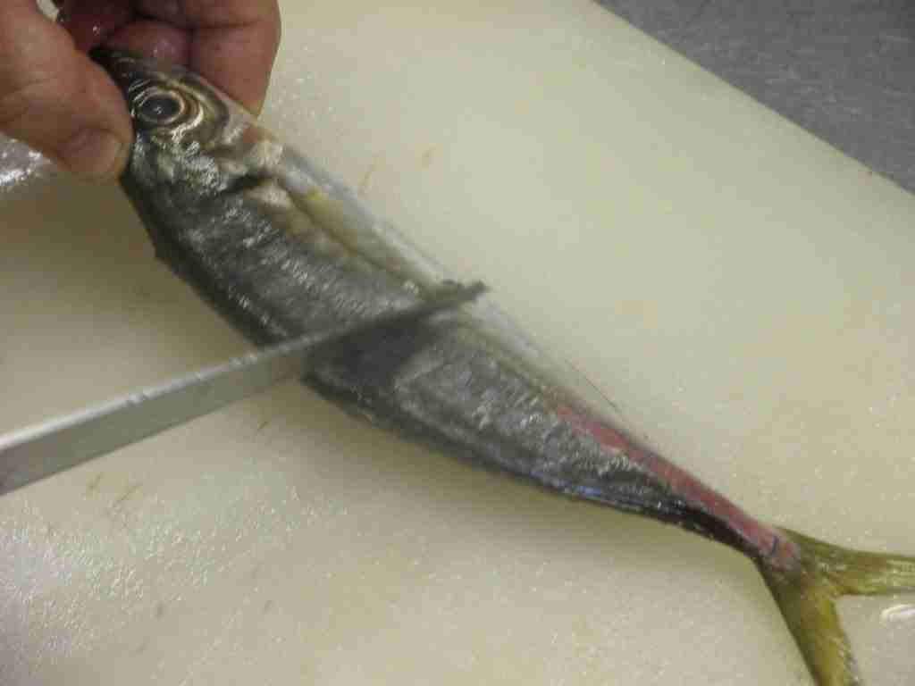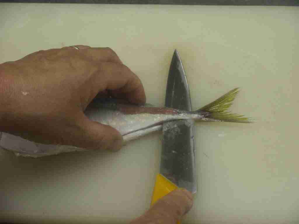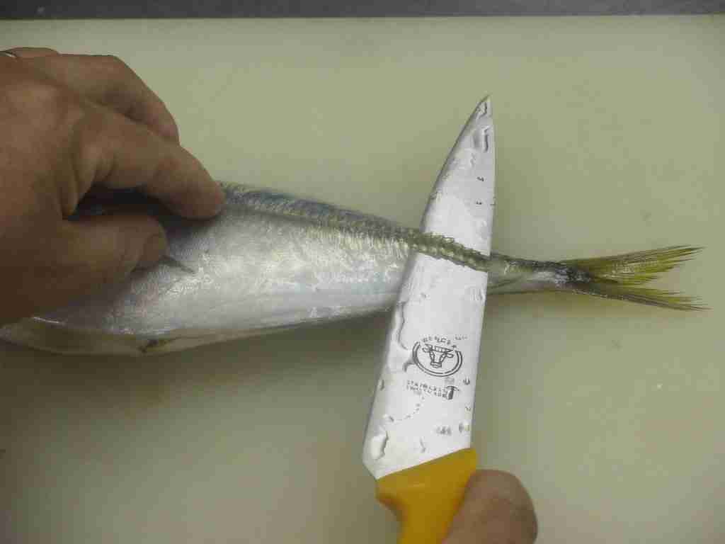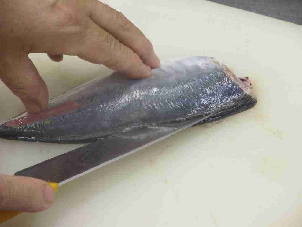- 頭を右側に、腹を手前にまな板におき、頭側から尾に向かって尻びれの上に包丁をあて、中骨にそって包丁を引きます。