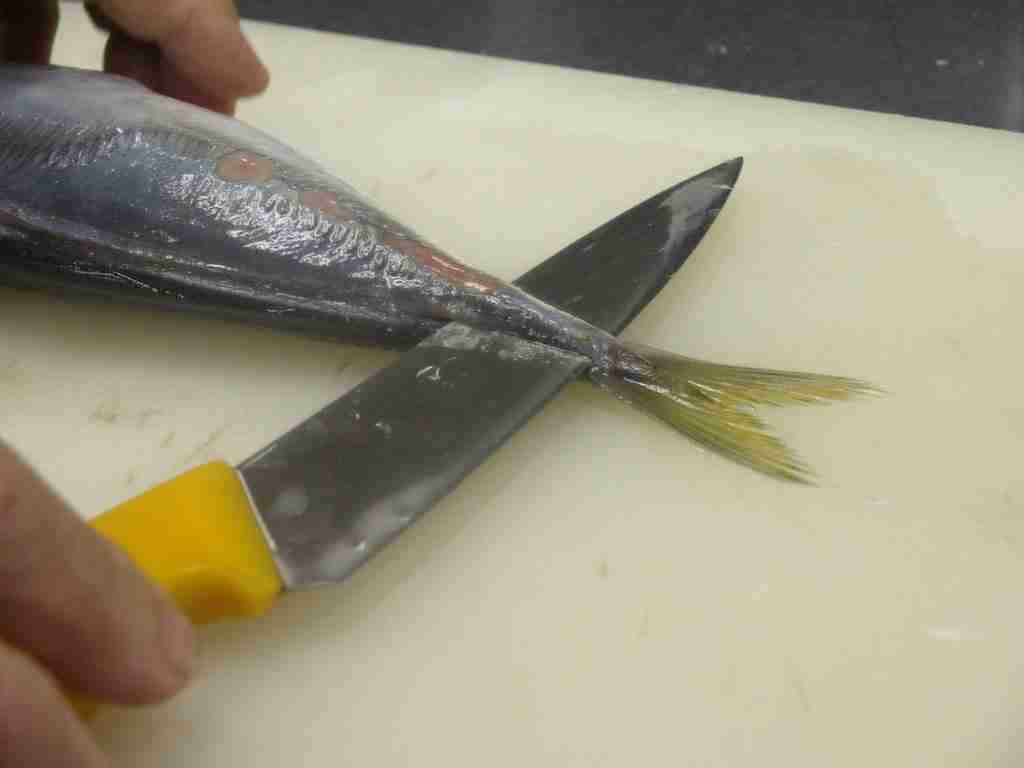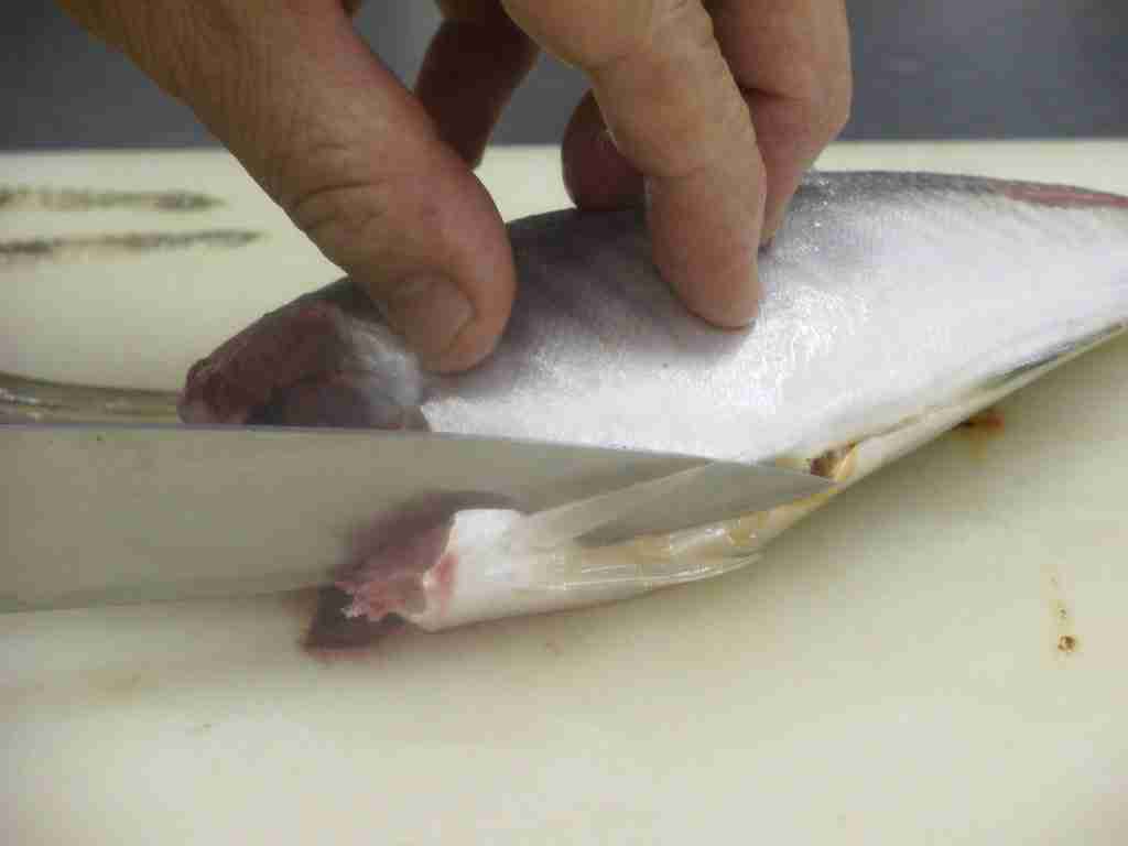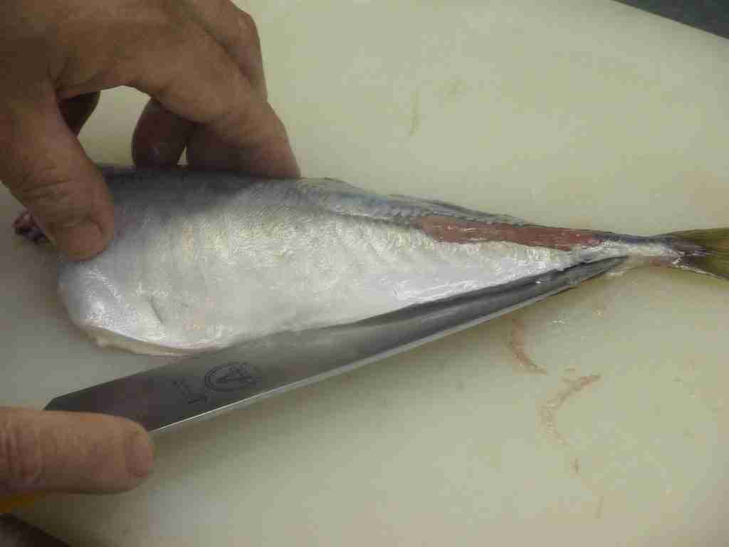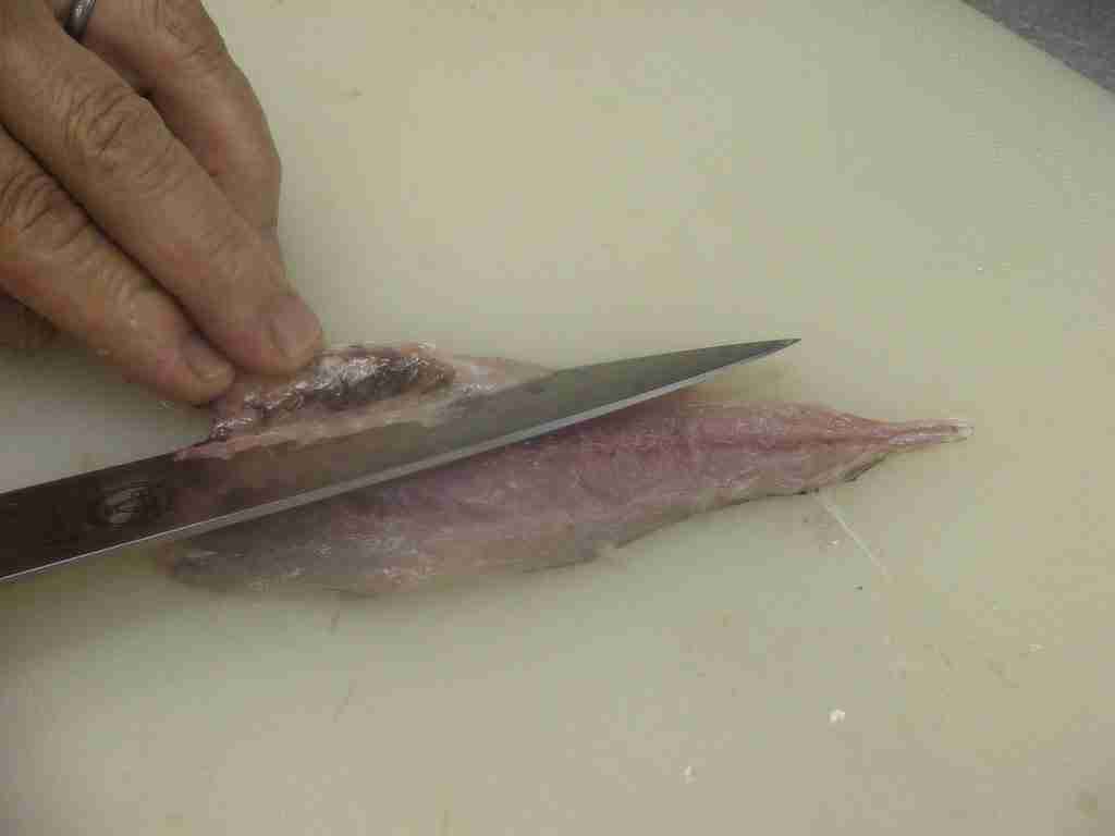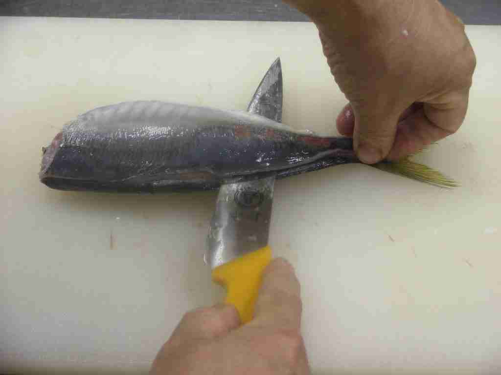 - 頭を右側に、腹を手前にまな板におき、頭側から尾に向かって尻びれの上に包丁をあて、中骨にそって包丁を引きます。