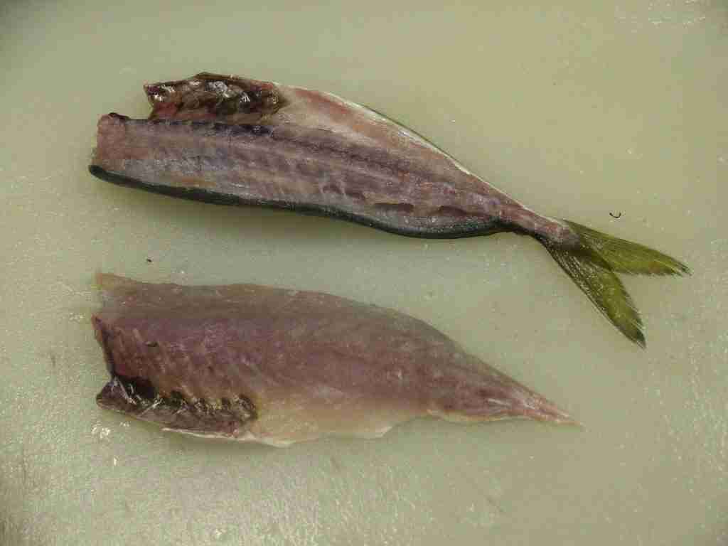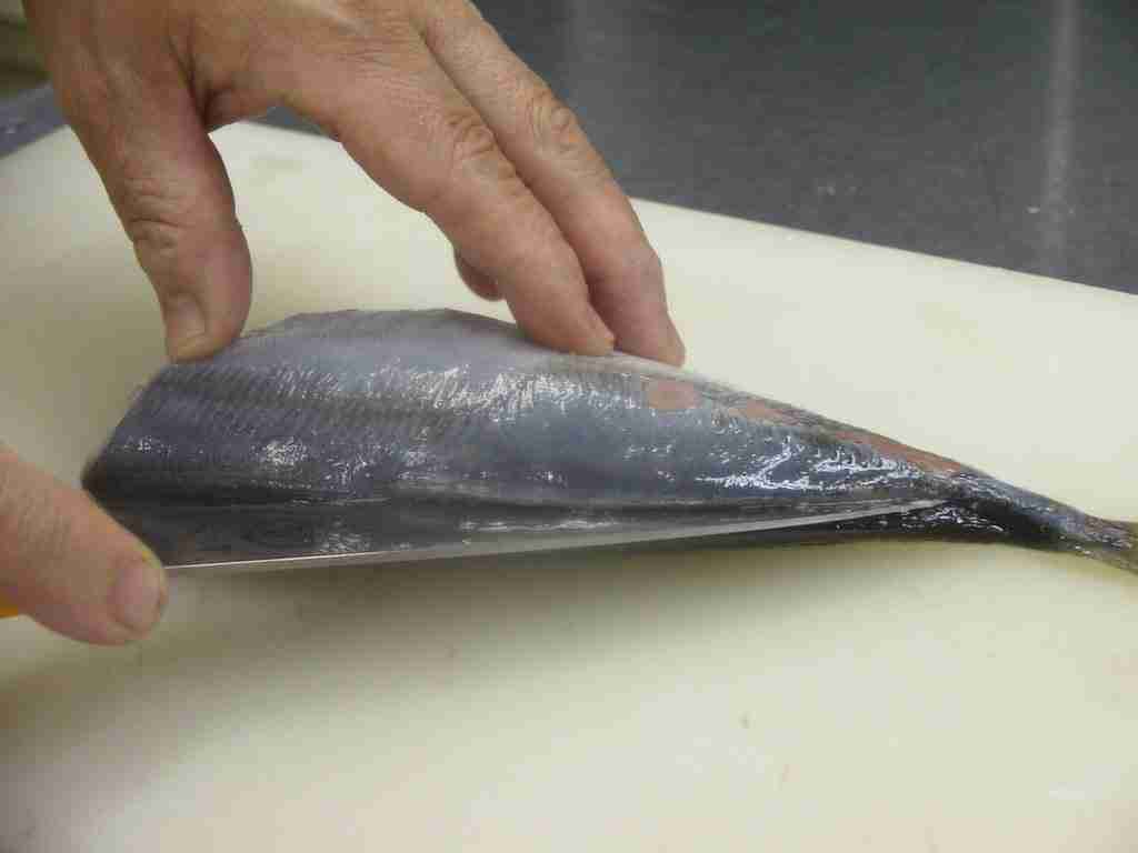 - まず、尾びれの近くの硬い「ぜいご」をとります。包丁で尾から頭に向かって、すきとるようにします。裏側も、同様にとります(皮をむいて使うときは、取らなくてよいです)