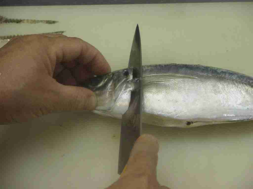 - 胸びれの右側から頭のほうに向かって斜めに、包丁を真ん中より少し先まで入れます。同様に、反対側からも入れ、頭をとります。