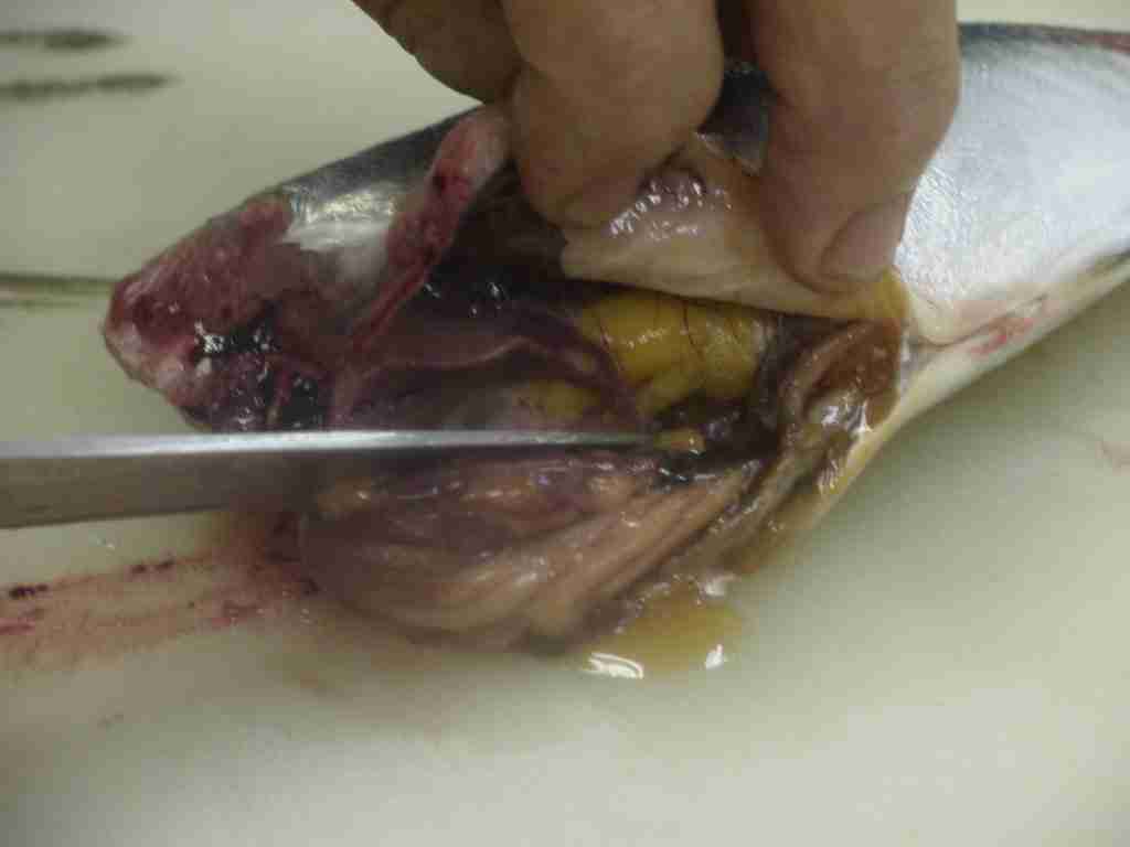 - 腹を開き、包丁の先で内臓を取り出します。