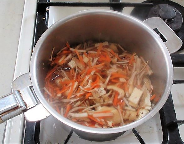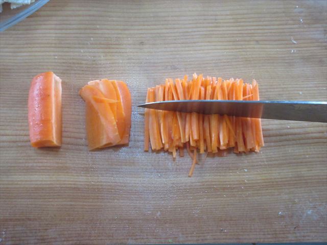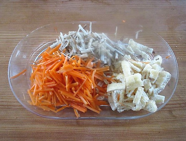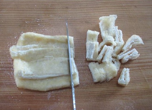 Corte o aburaage em tiras como a cenoura.