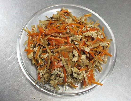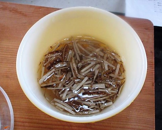 Lave o [Gobou] uma vez para tirar a cor de terra e corte em tiras como a cenoura. Coloque o [Gobou] na água por alguns segundos para tirar a cor de terra novamente. E depois jogue essa água fora.