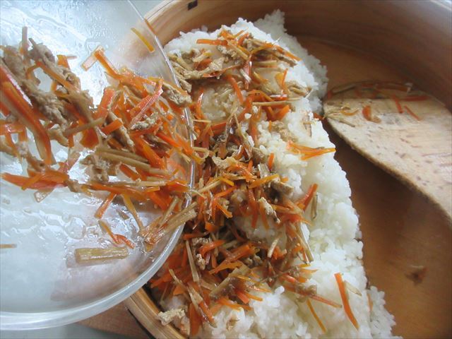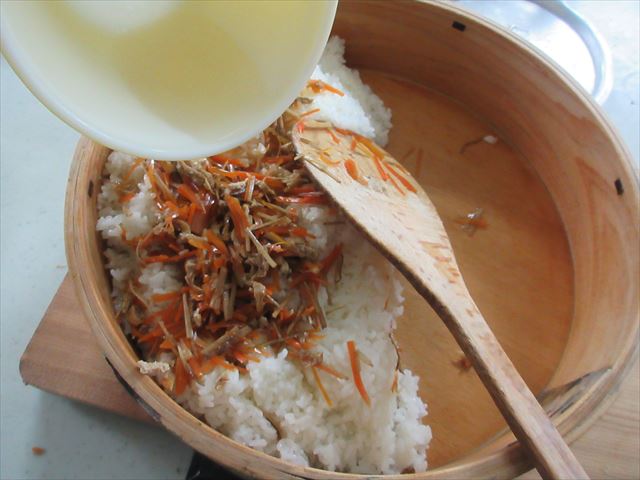 Coloque o No.2 em cima do arroz, despeje o awasezu de uma só vez e misture-os como se estivesse cortando.