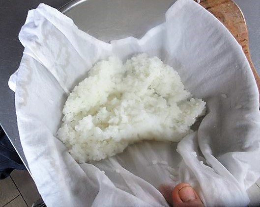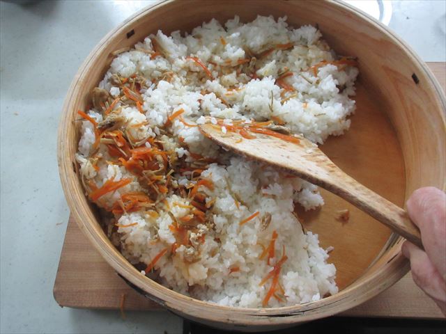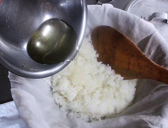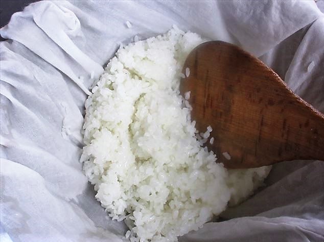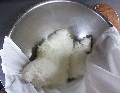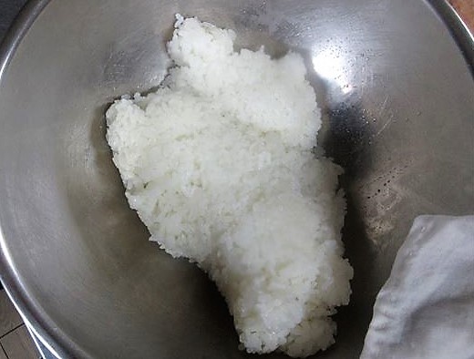 Caso não tenha o tacho de madeira, estique um pano úmido bem espremido (poderá usar um pano de prato limpo) em uma tigela grande e coloque o arroz recém-cozido. Em seguida, misture-o com awasezu e, por fim, retire o pano.
