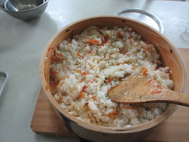 - Transfira o arroz recém-cozido em um tacho de madeira (em japonês chama-se Bandai ou Handai).