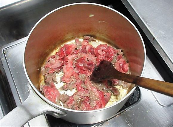 - (No Brasil) Como a carne do Brasil não é tão fina quanto a do Japão, coloque primeiro a carne e refogue-a.