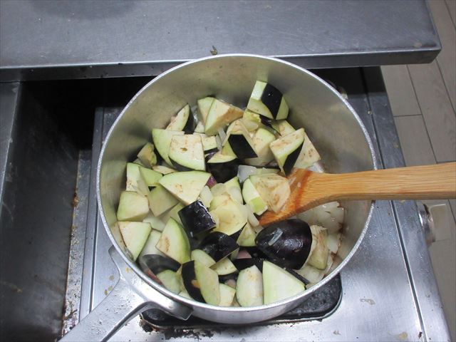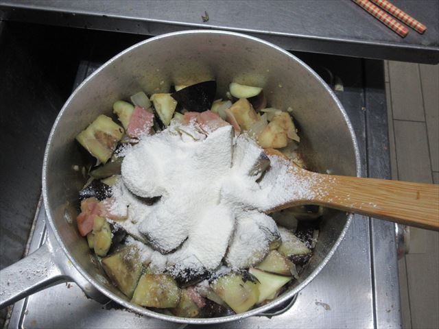 - Acrescente a farinha de trigo no número 4 e refogue bem em fogo baixo até que forme uma camada fina de cor marrom no fundo da panela. . Depois adicione o A, cozinhe até que as berinjelas fiquem macias e tempere com o B.