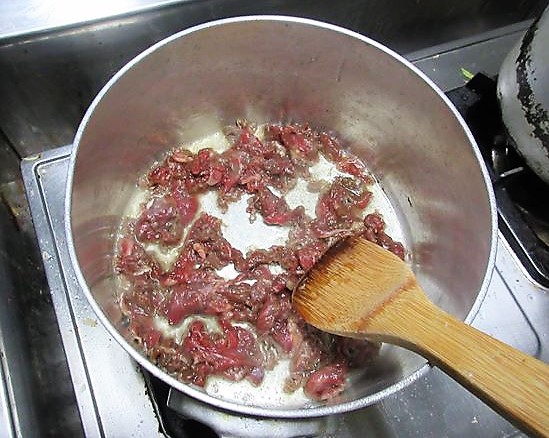 Mas se o [Wakame] seco estiver inteiro, coloque em uma vasilha com água para hidratar e, depois de hidratado, corte em tamanhos pequenos, fáceis para comer.- Se o [Wakame] estiver inteiro, hidrate, corte e refogue com a carne.