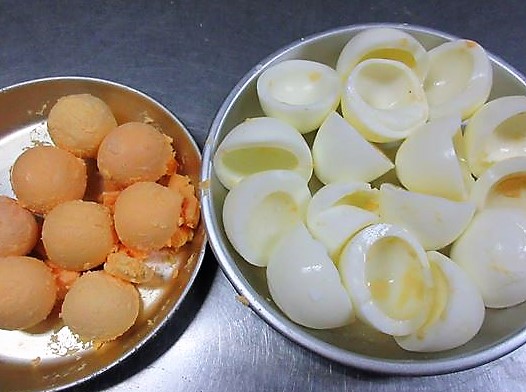 - Cozinhe os ovos e assim que estiverem cozidos, retire-os do fogo e coloque-os imediatamente em água fria para resfriá-los. Descasque-os e separe as gemas das claras. Se não separá-las logo, o sulfeto de ferro que tem dentro da gema com o calor formará ao redor da gema uma cor esverdeada sem brilho, ao invés da cor amarela brilhante.