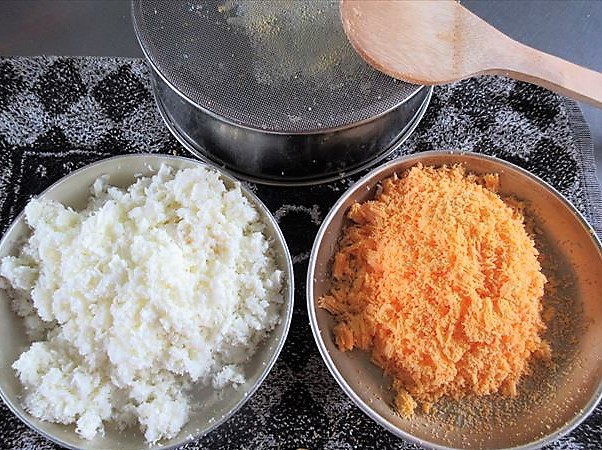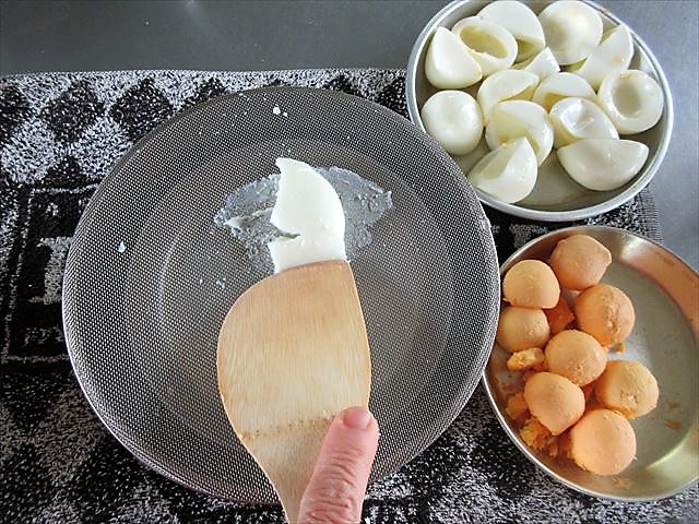 - Cozinhe os ovos(com gemas duras-Como fazer um ovo cozido- ), separe as claras e as gemas dos ovos e peneire separadamente.