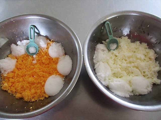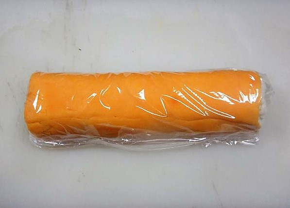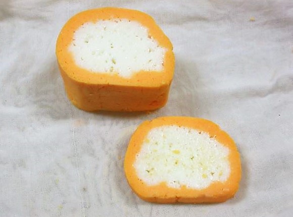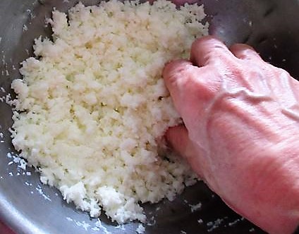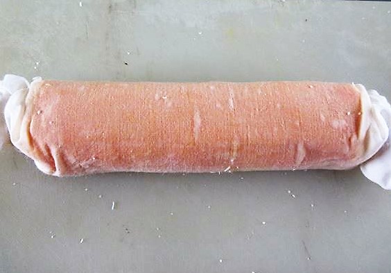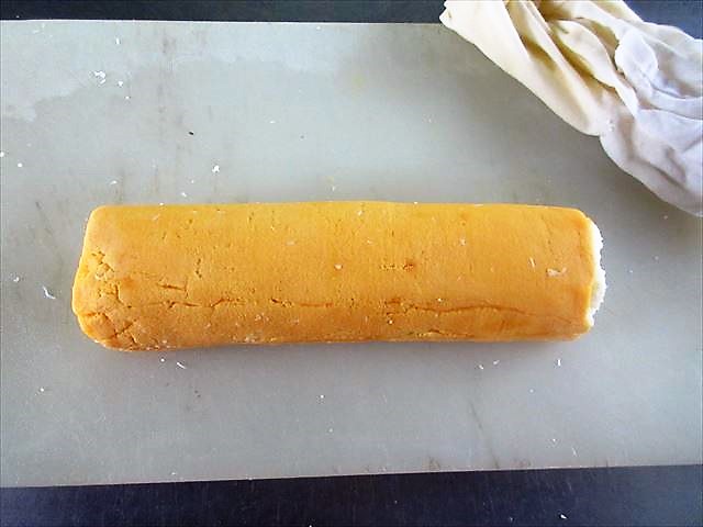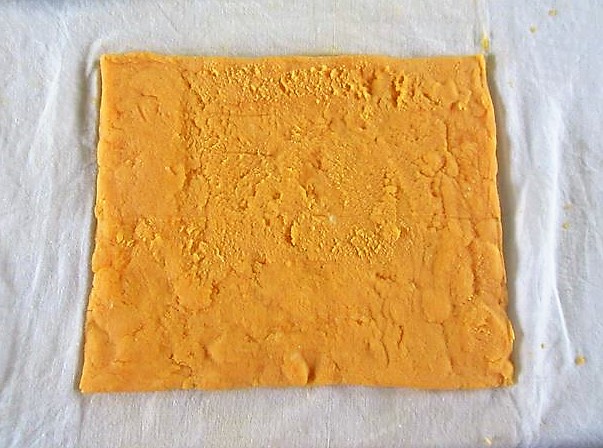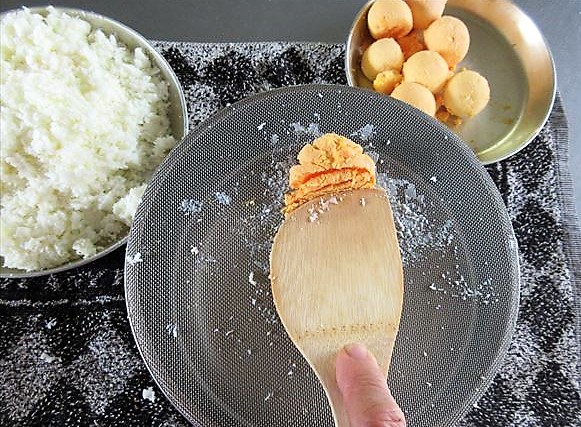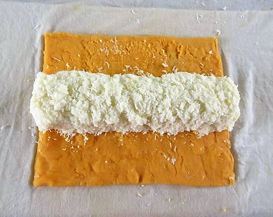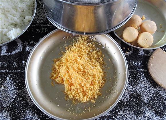 - Estenda uniformemente as gemas batidas em um pano fino umedecido, em uma área de 15~16cm de altura com 18~20cm de largura e 7 ou 8mm de espessura e no meio coloque as claras em forma de bastão.
