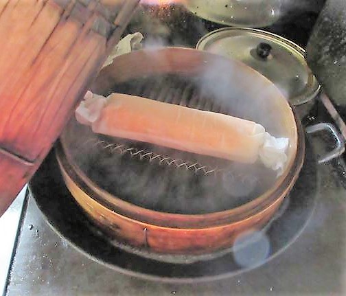 - Enrole usando o pano fino, e desse modo, cozinhe em banho-maria por 10 minutos. Caso não tenha um pano fino, enrole com papel filme e leve ao micro-ondas por 3 minutos, entre 500W e 600W.