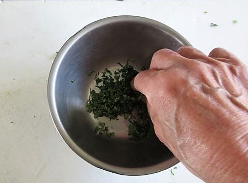 Pique a folha de nabo(1), salpique com sal, depois lave com água para retirar o sal e escorra essa água.