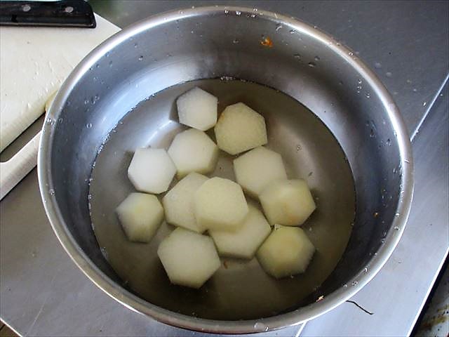 - Este é um cozido de Ano Novo com legumes cortados em pedaços decorativos. Se você estiver preparando este prato como acompanhamento, o broto de bambu, as cenouras e o gobou devem ser cortados com cortes aleatórios (ranguiri), o konnyaku deve ser cortado em pedaços com as mãos, os cogumelos devem ser cortados obliquoamente em pedaços grandes e o inhame deve ser cortado em rodelas.