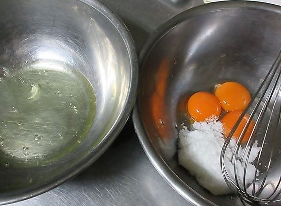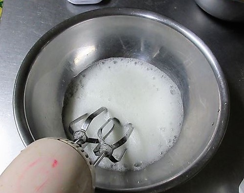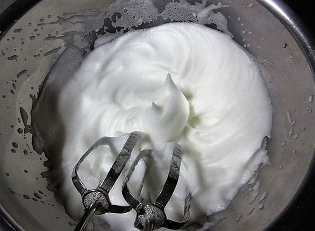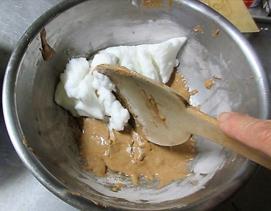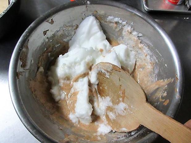 - Faça as claras em neve, coloque 1/3 no No.5(1), misture bem e depois coloque o restante das claras em neve(2) misturando levemente(3).