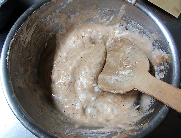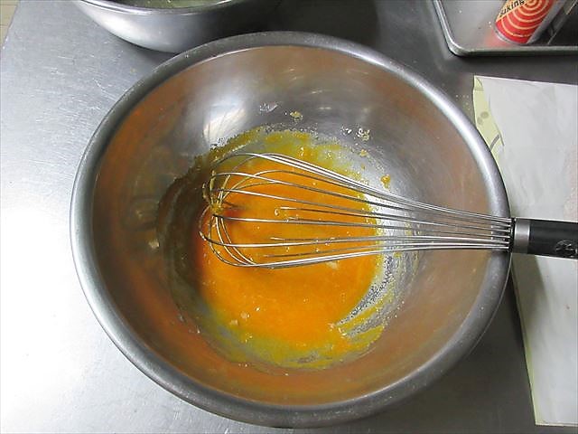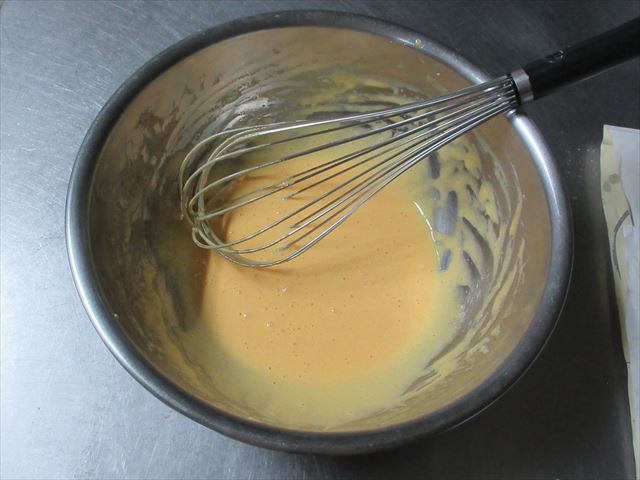 - Coloque o B numa tigela, misture bem com um batedor de claras até ficar esbranquiçado.