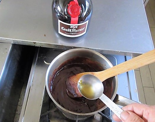 - Quando o chocolate dissolver por completo, coloque o licor de laranja e misture bem. Coloque o creme de leite