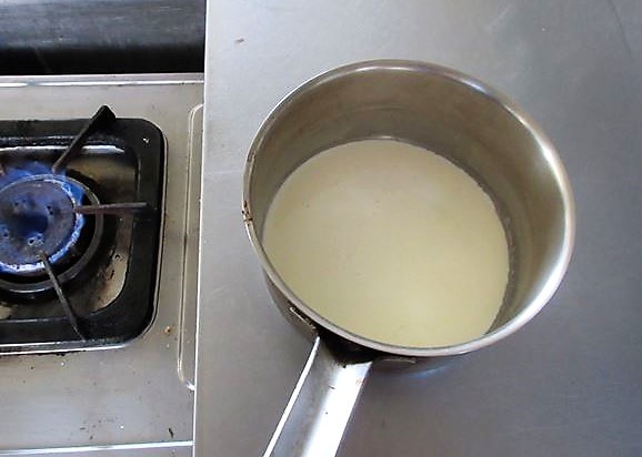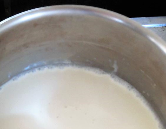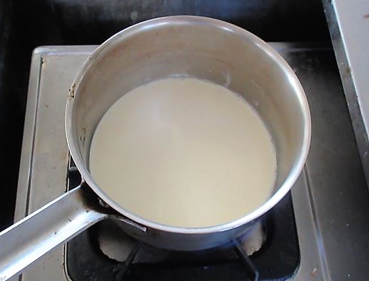 - Coloque na panela de 15cm o creme de leite e leve ao fogo. Quando começar a levantar um pouco da fervura, retire do fogo e mexa a panela. Repita essa operação por mais três vezes. Na quarta vez, quando começar a levantar fervura, retire do fogo e adicione o No 1. Depois, misture bem.