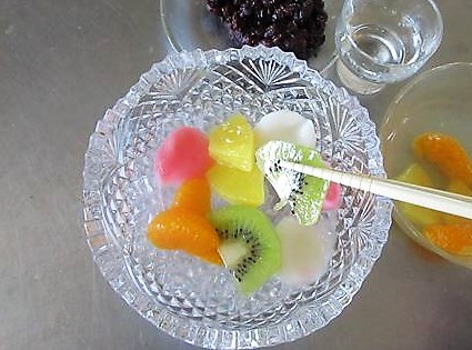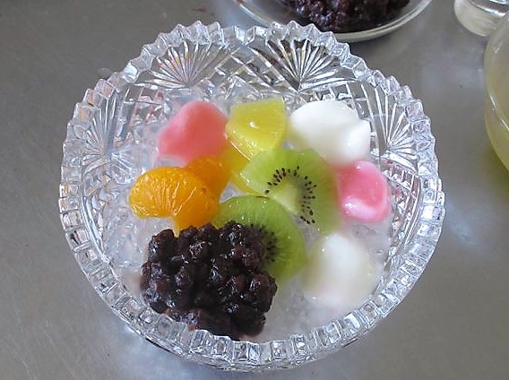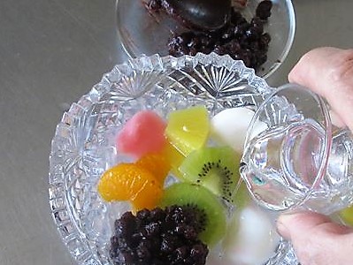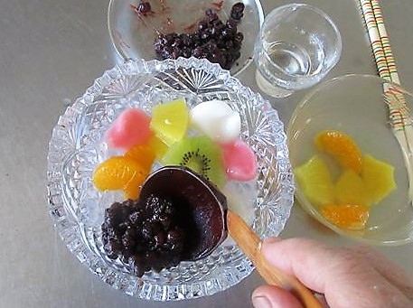 - Numa tigelinha, monte o [Kanten] já cortado em quadrados de 1cm, o [Shiratama dango], as frutas, o [Anko] e coloque o xarope de açúcar por cima.