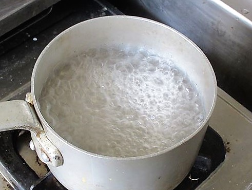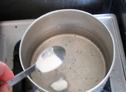 Coloque a água e o açúcar numa panela e leve ao fogo. Depois de ferver, coloque na vasilha e deixe esfriar.