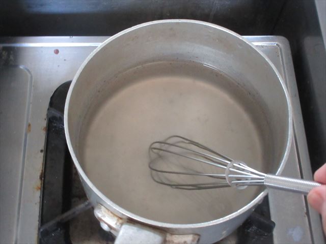 Coloque na panela o [Kanten] em pó e a água, depois misture bem. Ponha no fogo e quando ferver, despeje na forma. Deixe endurecer até ficar com uma espessura de cerca de 1 cm. Evite balançar a forma.