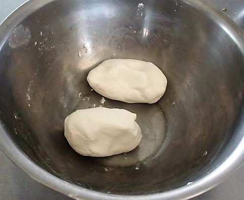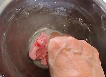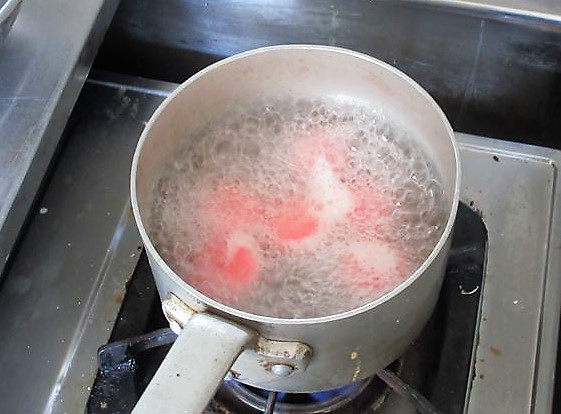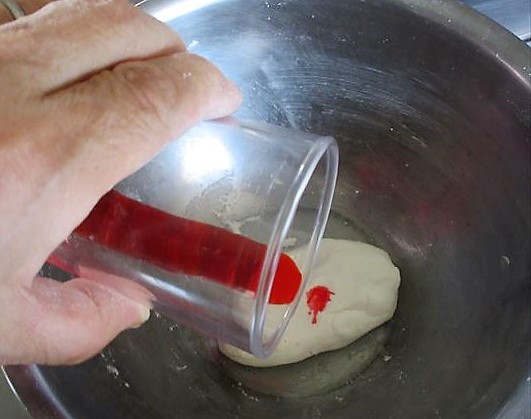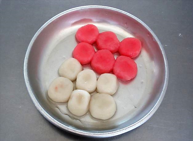 Coloque na vasilha o [Mochigome] em pó, coloque a água aos poucos misturando bem. Divida a massa em dois e em uma das partes coloque uma pitada de corante vermelho para dar cor aos bolinhos. Na outra parte, deixe branco. Depois, faça as bolinhas em pares; brancas e rosas.