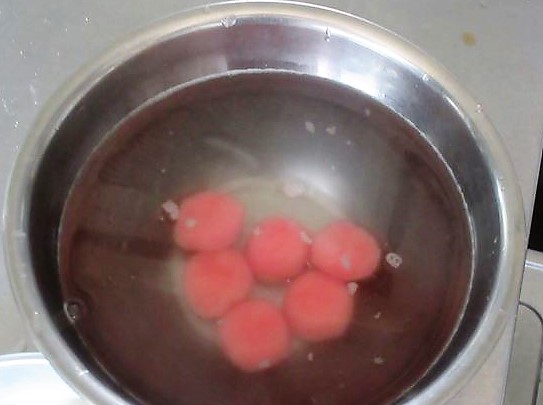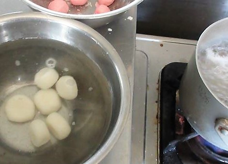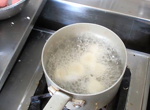 Coloque as bolinhas na água fervente e deixe cozinhar. Quando as bolinhas flutuarem, retire-as e coloque-as na água fria. Quando esfriar, tire as bolinhas da água e coloque-as em uma vasilha.